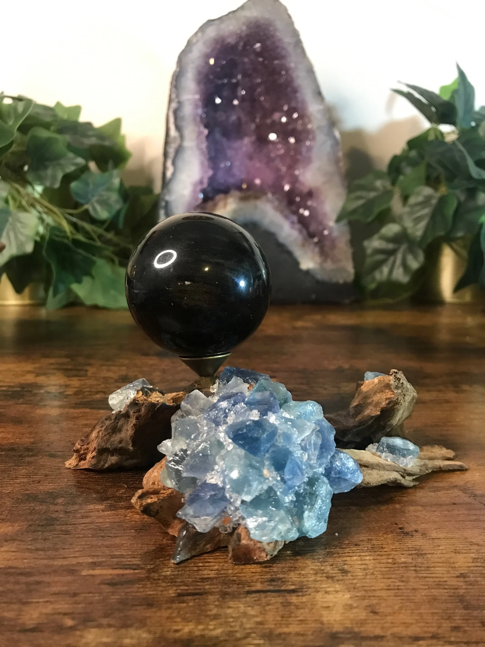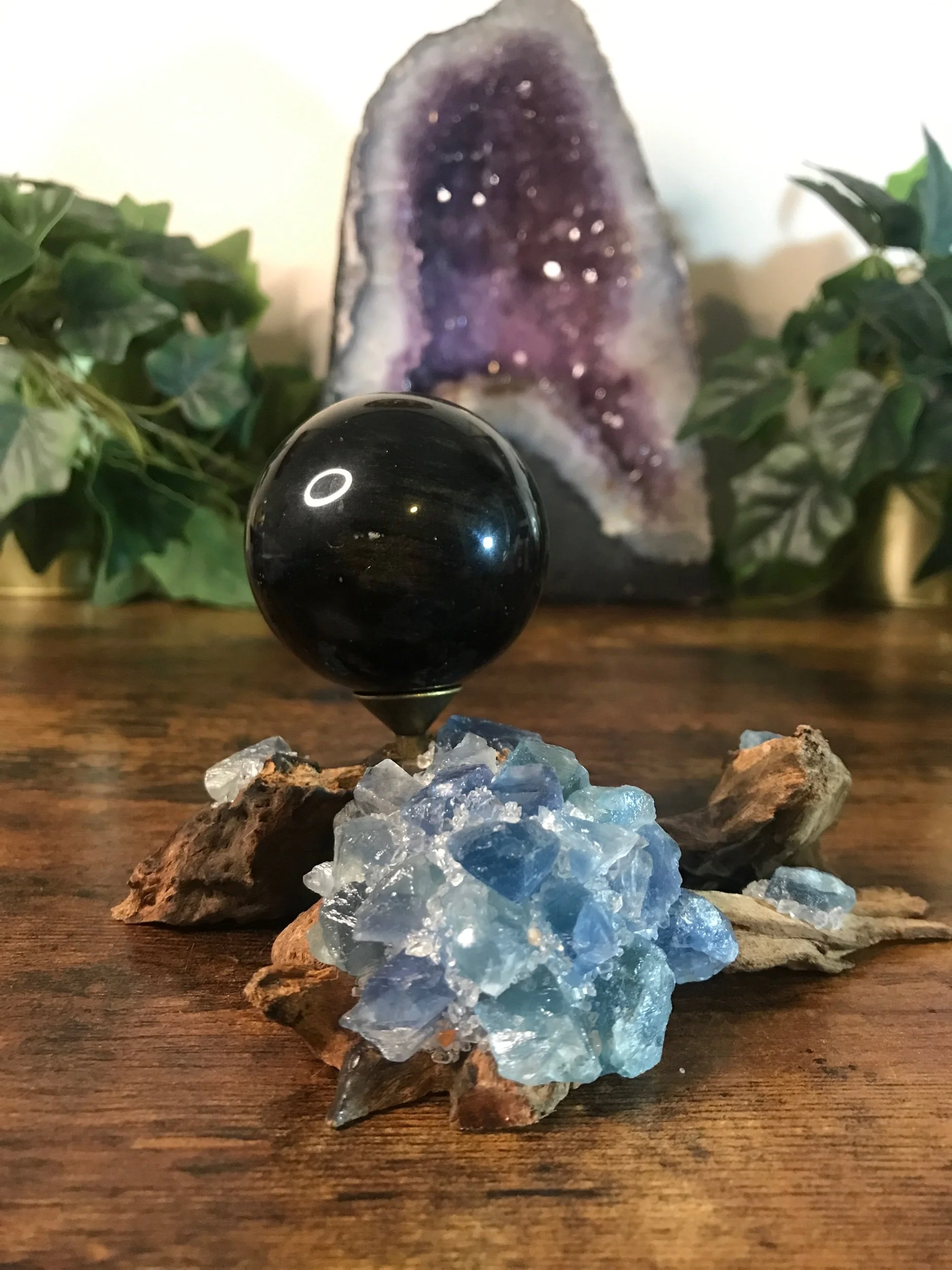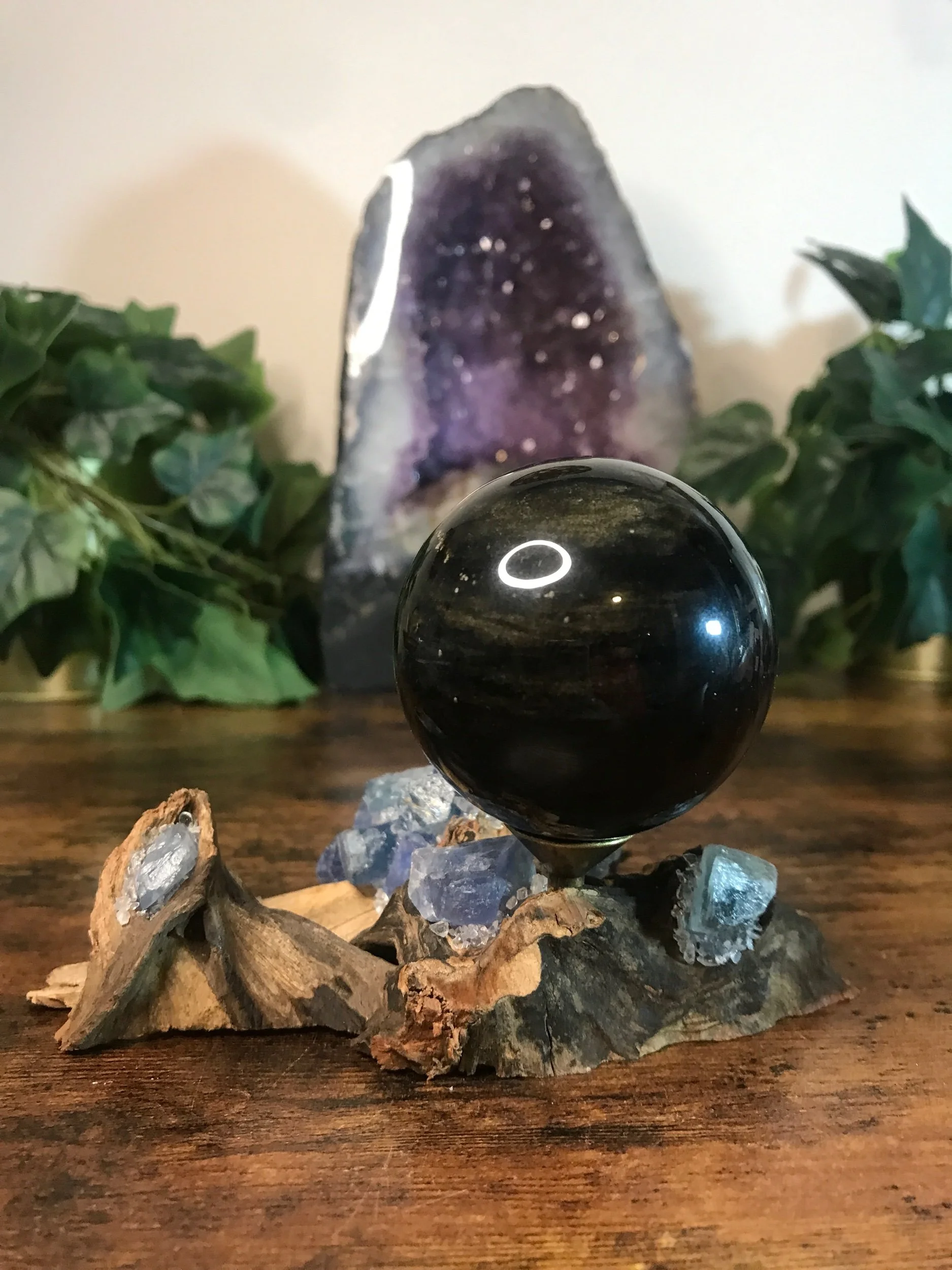 54 mm Gold Sheen Obsidian Sphere + Blue Fluorite wood stand.